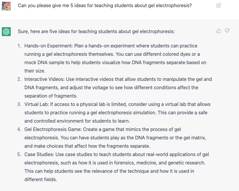 Today, my daughter was extremely excited about doing a gel electrophoresis lab in her Biology class. She was so excited that she took pictures and videos of the lab and shared them with the whole family (middle school brother included). I asked ChatGPT for 5 ideas for teaching gel electrophoresis.