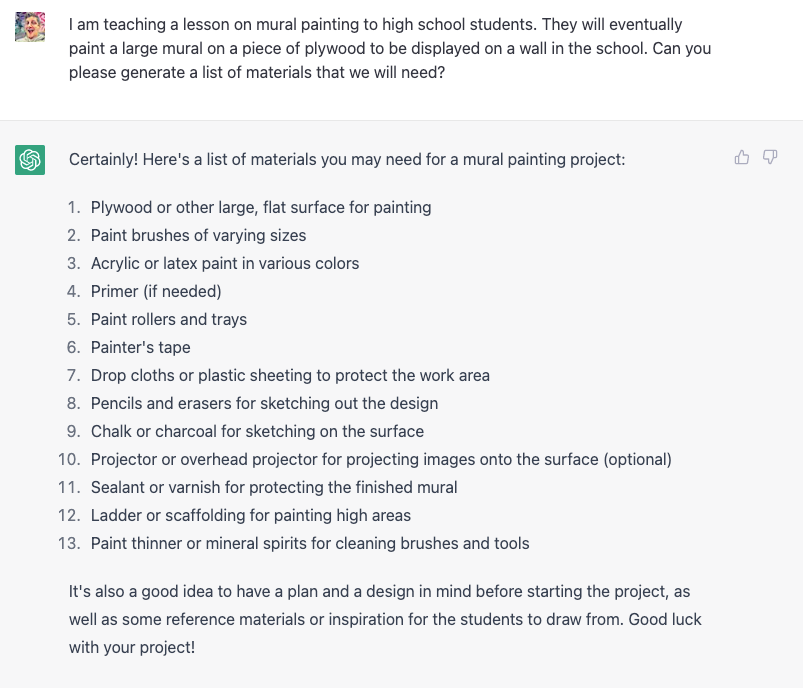 In my classroom life, I taught Visual Arts. Mostly Digital Art, Design, and Animation., but also photography, sculpture, and a few others. Ordering new materials to start the year is an absolute pain. No one wants to prepare orders in the spring only to come back in the fall to find out that needed materials are missing. I asked ChatGPT to brainstorm materials for a lesson to help ease ordering.