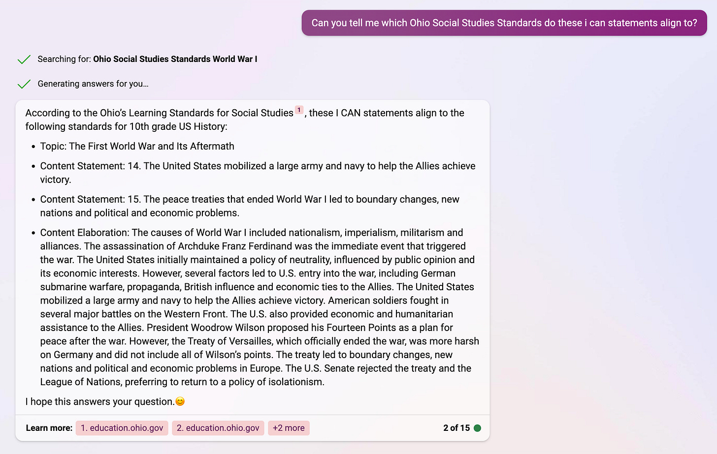 Again, it cited and linked its sources (the Ohio Department of Education). It also totally ignored (or understood) my grammatical typo in the prompt. I did double-check these state standards and double-checked with a long-time colleague who teaches US History in Ohio.