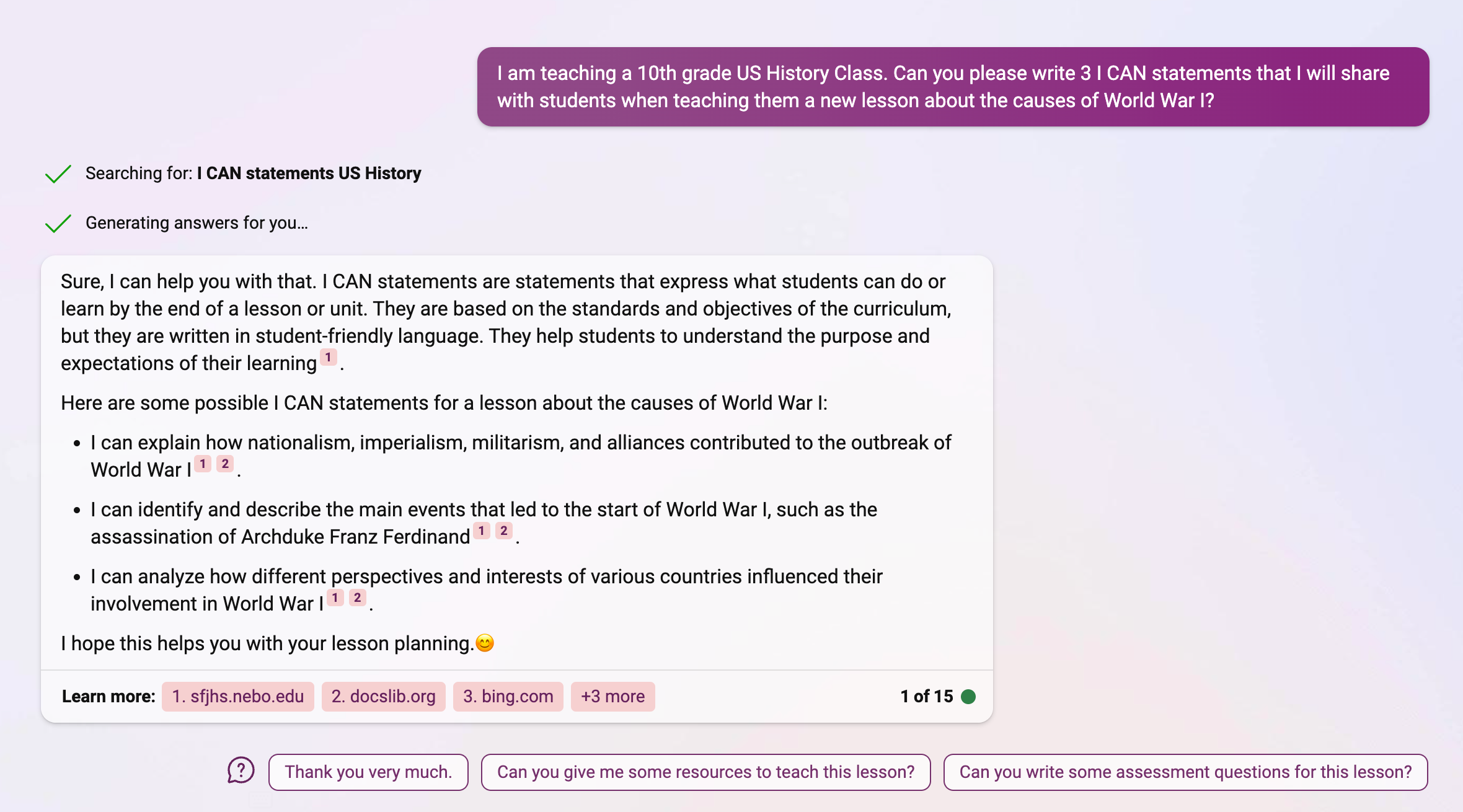 Notice how Bing even offers suggested follow-ups? The natural follow-ups include asking for resources and assessments. Unlike ChatGPT, you'll notice Bing citing its sources.