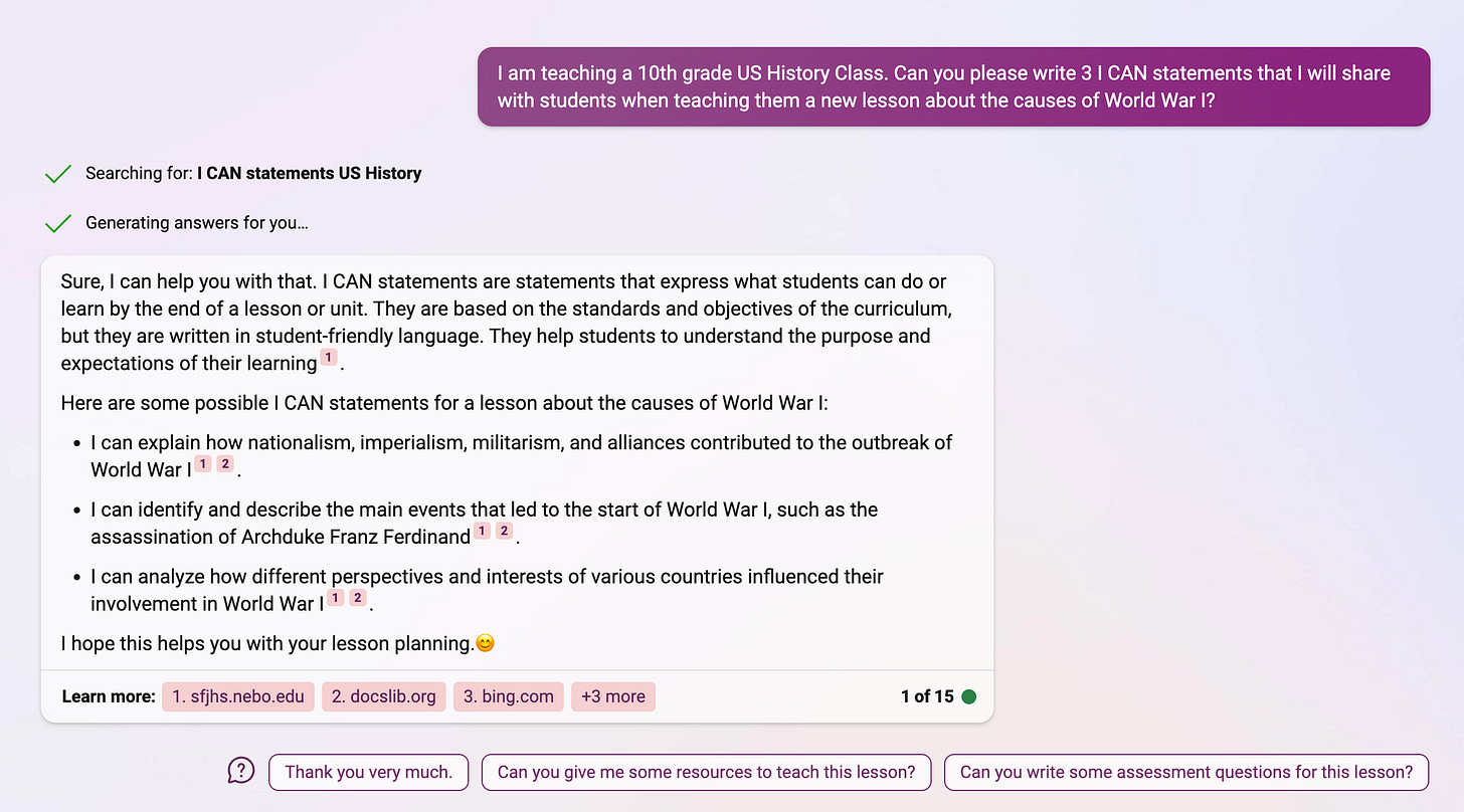 We've all posted "I can" statements to the board at the front of the room. AI can help you write those statements as well. This time around, I tried Bing's new chatbot (which is powered by OpenAI's newest algorithm). Tip: If you want to try Bing's chatbot, try using Microsoft Edge instead of Safari or Chrome as your browser.