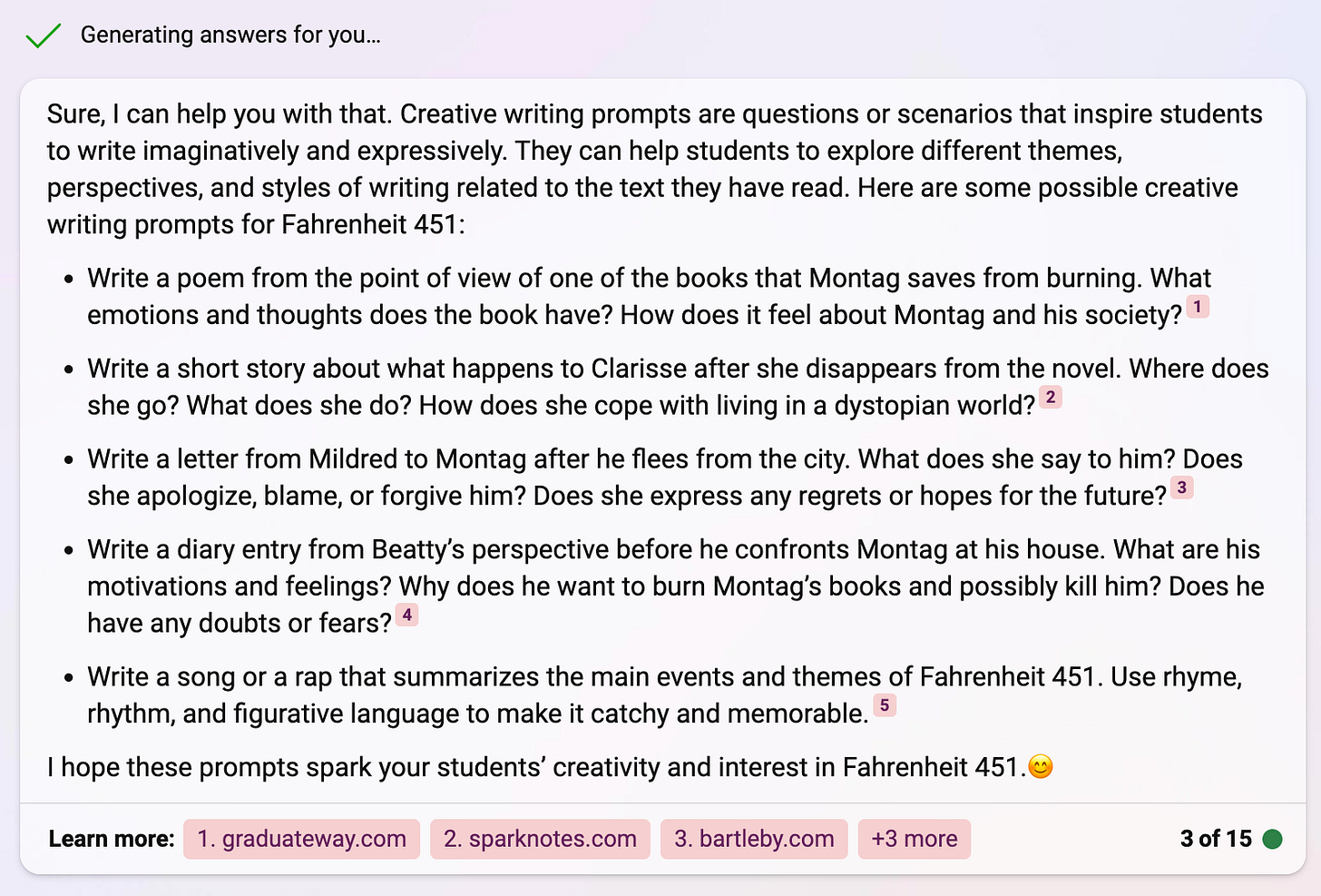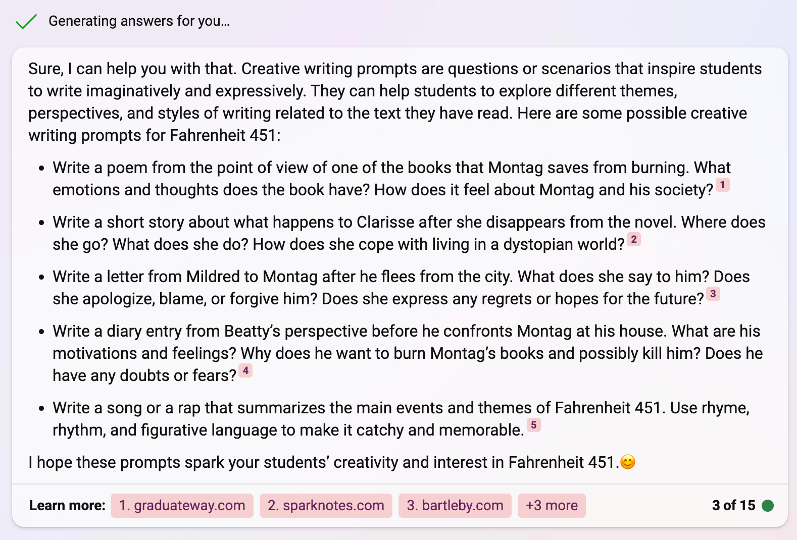 Something interesting has happened here. I think this response shows the potential of AI as a timesaver for teachers. The prompts, at their core, are fairly common. They generally ask students to analyze themes, settings, and characters. However, the AI has done some brainstorming for the form the prompt might take (poem, short story, diary entry, song, etc.) and parsed it with some kind of prompt. I followed some of the citations used here, and none featured the prompts verbatim.