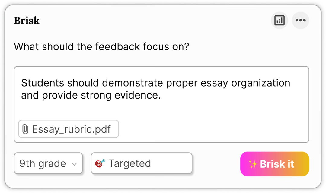 Brisk is a Google Chrome Extension that helps teachers give feedback to students more effectively by providing AI-powered suggestions and insights on their work. It analyzes student writing and offers suggestions for improvement in areas such as grammar, clarity, and organization. The tool can also generate other curriculum essentials like quizzes and DOK questions, but the feedback is by far my favorite part of the extension.